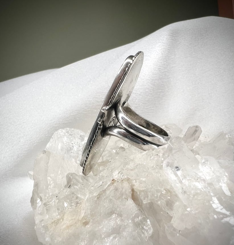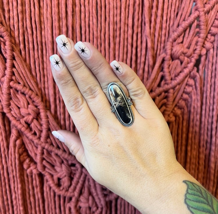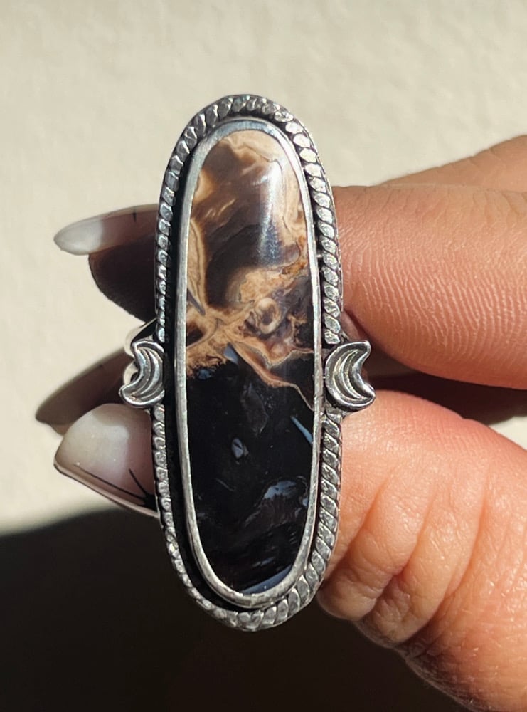 Petrified palm root cabochon set in fine and sterling silver with crescent moon adornments. Split shank ring band. Fits 6.5-6.75 ring size.