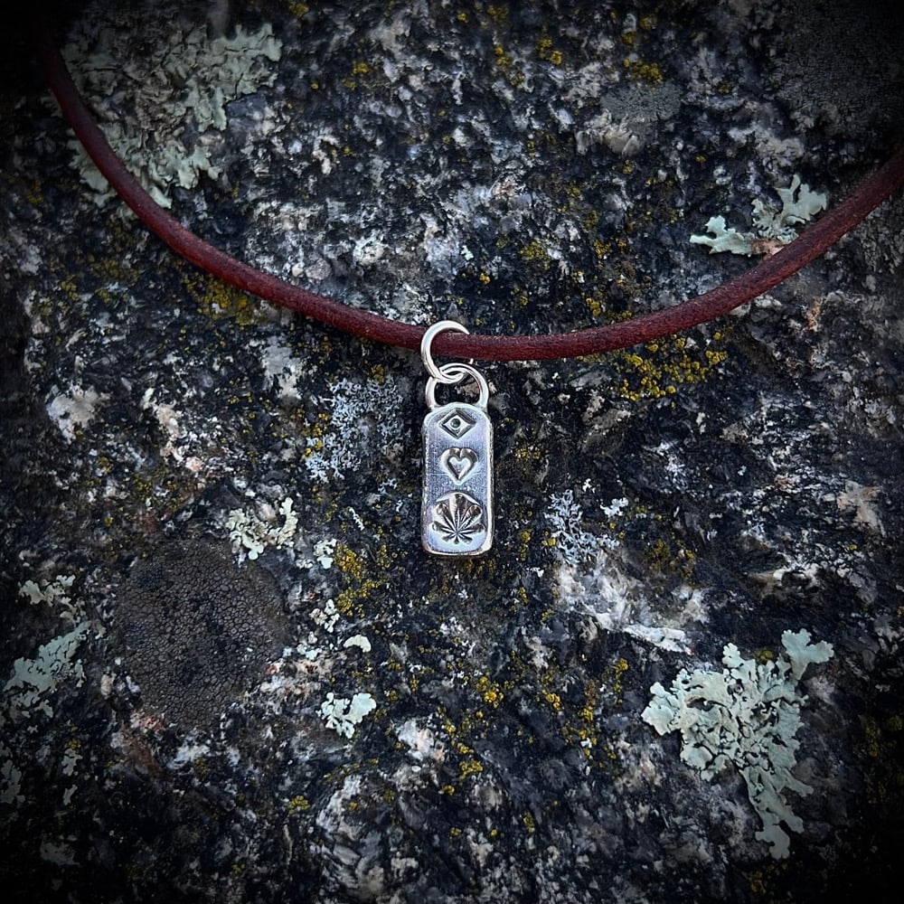 Eye Heart CannaLeaf pendant on adjustable 3mm Leather cord.